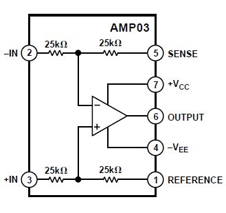 The AMP03BJ is a monolithic unity-gain, high speed differential amplifier. Incorporating a matched thin film resistor network, the AMP03BJ features stable operation over temperature without requiring expensive external matched components. The device is a basic analog building block for differential amplifier and instrumentation applications. The differential amplifier topology of the AMP03BJ both amplifies the difference between two signals and provides extremely high rejection of the common-mode input voltage. By providing common-mode rejection (CMR) of 100 dB typical, it solves common problems encountered in instrumentation design. As an example, the AMP03BJ is ideal for performing either addition or subtraction of two signals without using expensive externally matched precision resistors. The large common-mode rejection is made possible by matching the internal resistors to better than 0.002% and maintaining a thermally symmetric layout. Additionally, due to high CMR over frequency, the AMP03BJ is an ideal general amplifier for buffering signals in a noisy environment into data acquisition systems.